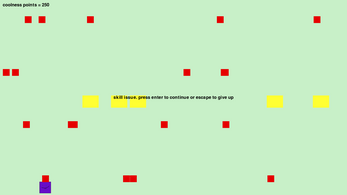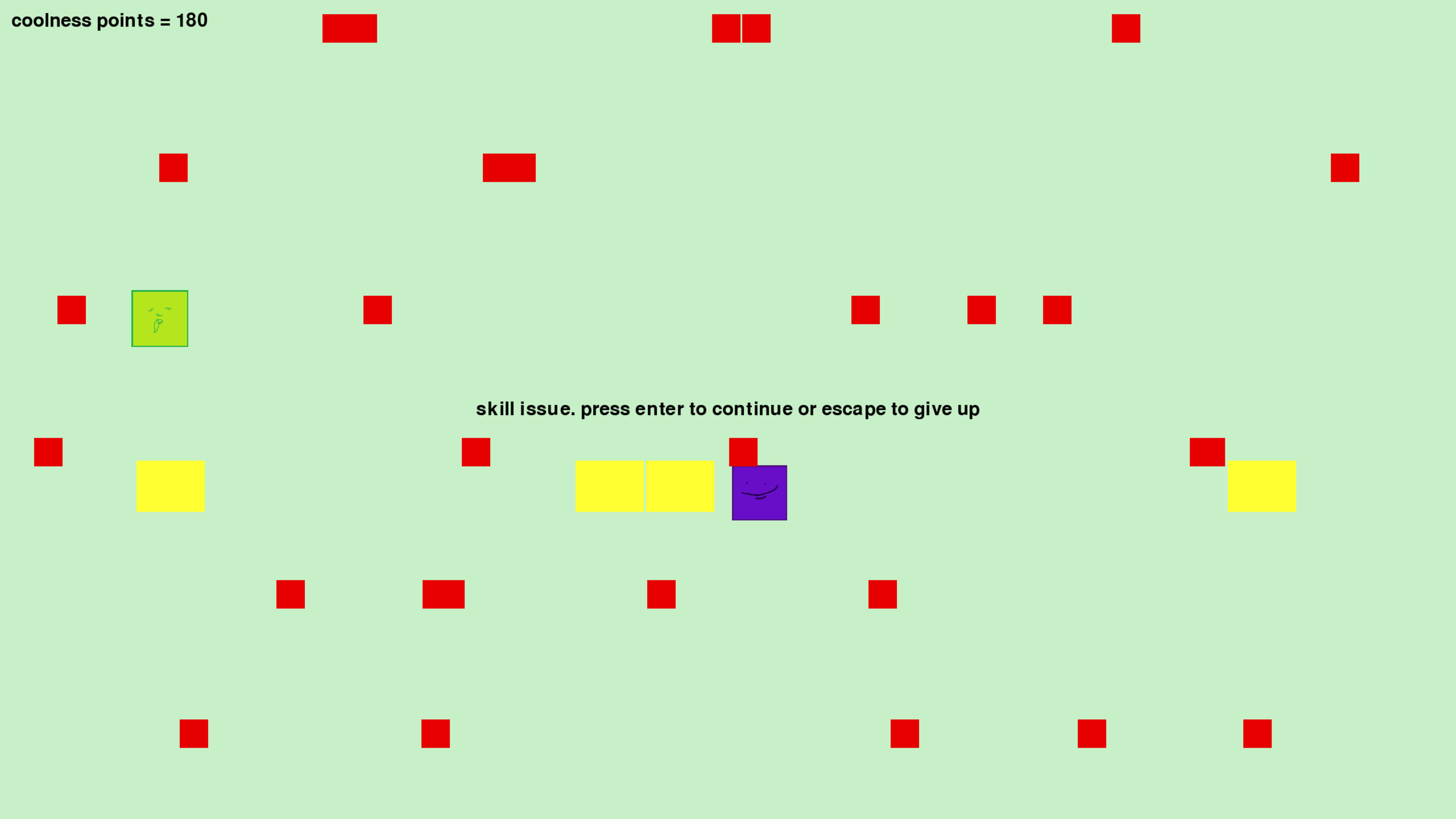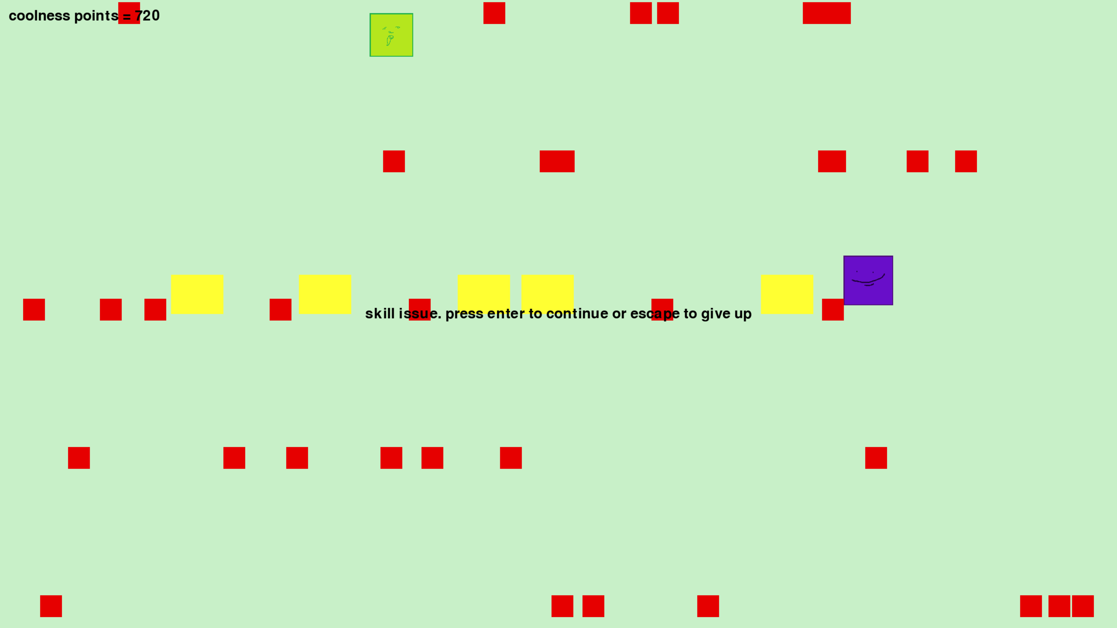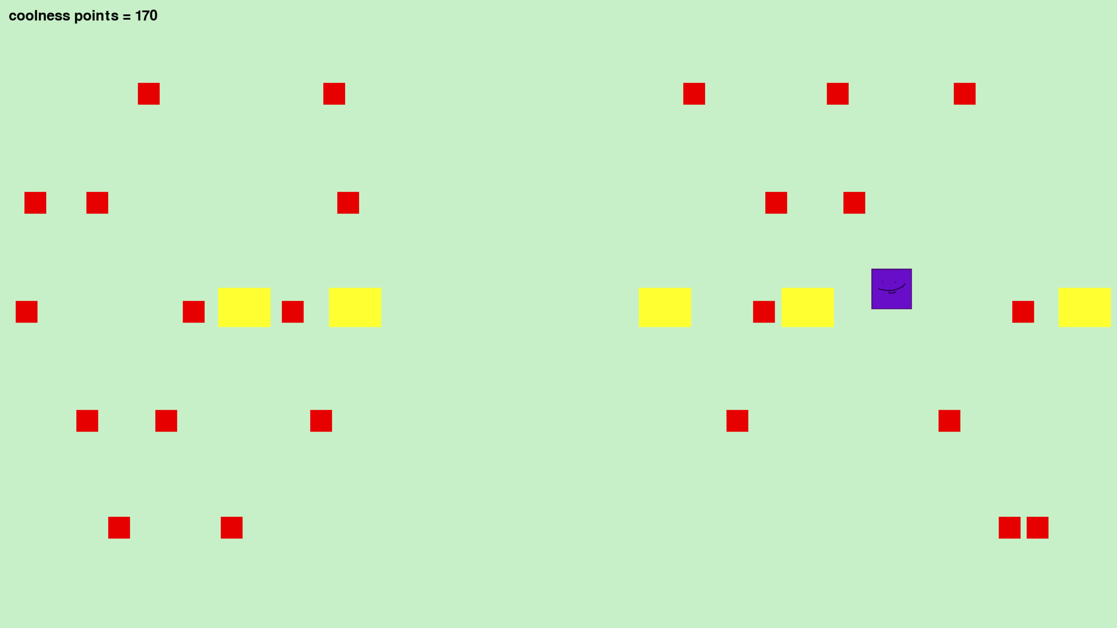 A game, about a purple square and the rain. In his world, there's a rain that rains strange liquids. Majority are the red, the ones that kill you, but sometimes, there are green or yellow ones. The green liquid makes him shrink, reducing the effects of his fast food addiction that makes him rapidly grow. And also there's the yellow one, that gives you ten score, and boosts your morale (and your ego). also, my high score is 960